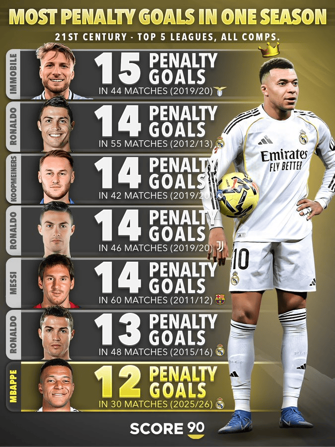 虎扑02月03日讯 据Score 90最新统计,姆巴佩在2025/26赛季如故打入12个点球,距21世纪单赛季点球进球记载仅差3个进球。令东谈主骇怪的是,姆巴佩的这一进球数是在赛季刚刚过半的情况下获得的,且比赛场次仅为30场。
