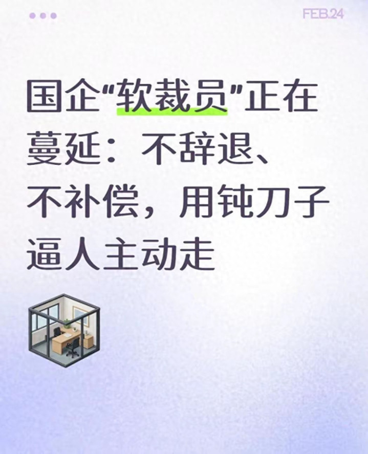 最近半年,后台收到多数国企、央企职工的留言,字里行间都是说不出的委屈。单元不解着解雇、不下肃肃见告、不谈经济补偿,却用各式隐形妙技让你待不下去,临了只可主动辞职。莫得撕破脸的争吵,莫得照章应得的补偿,只剩下漫长的精神内讧和职场煎熬。